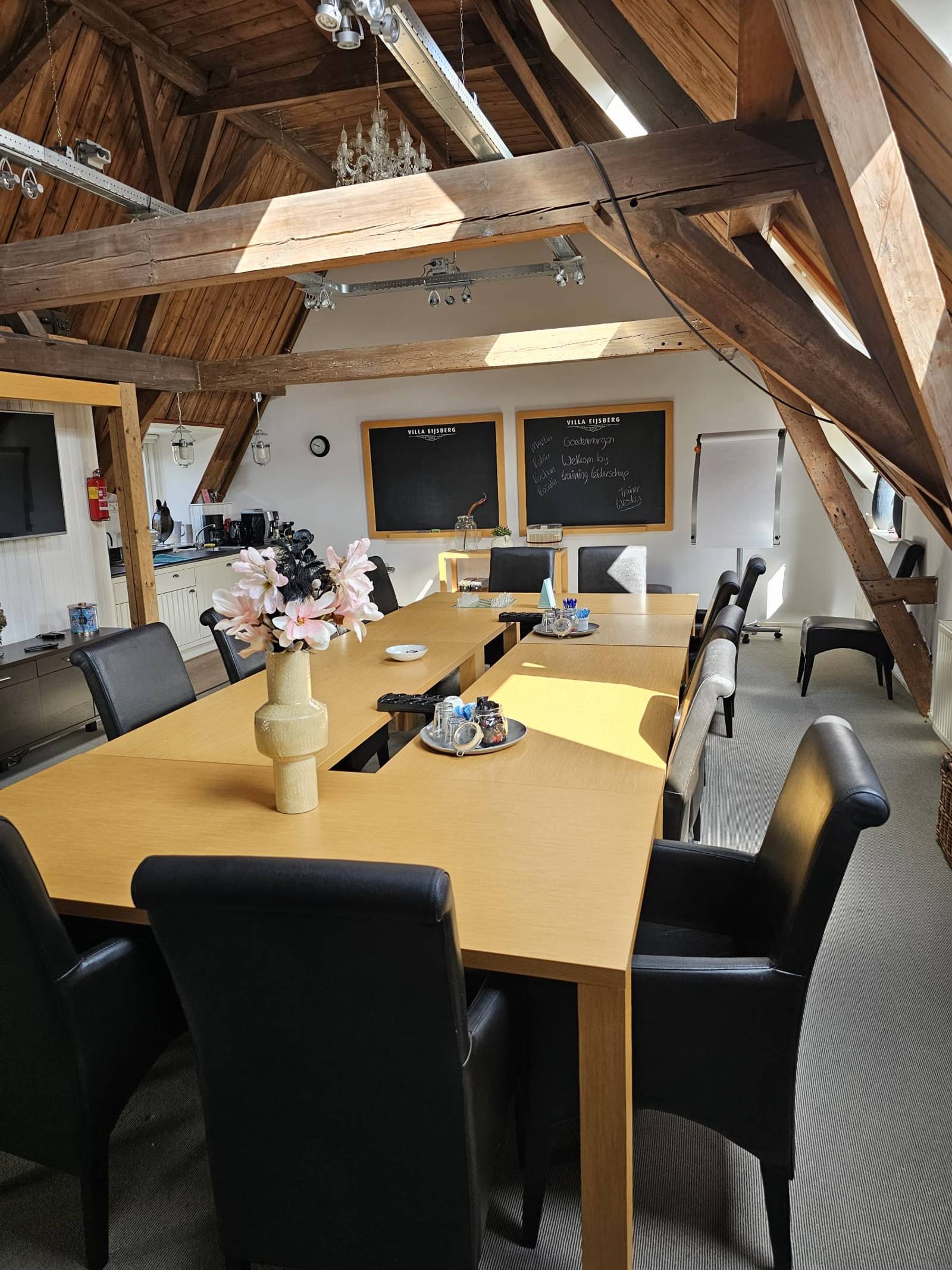 Een gevulde koelkast, een videoscherm, flip-over of krijtborden voor presentaties, en wat er niet is regelen we voor je! Alle ruimte voor overleg tot wel 14 personen.